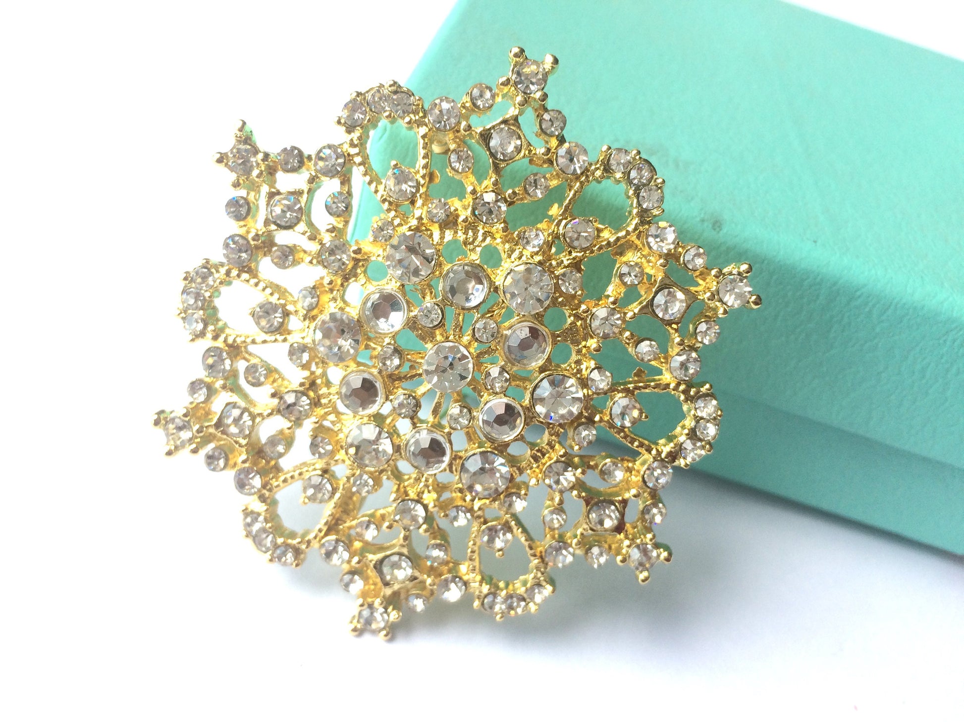 This gold crystal rhinestone embellishment brooch pin made in alloy metal with sparkly crystal rhinestones and one ring of acrylic around the center. This is perfect for wedding cake, jewelry making, sew onto sash or belt or other craft project. Properties: glass clear rhinestone crystals, acrylic Color: silver tone or gold tone Description: have loop hook at center style or nothing at back style