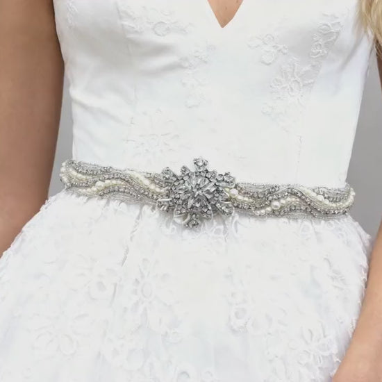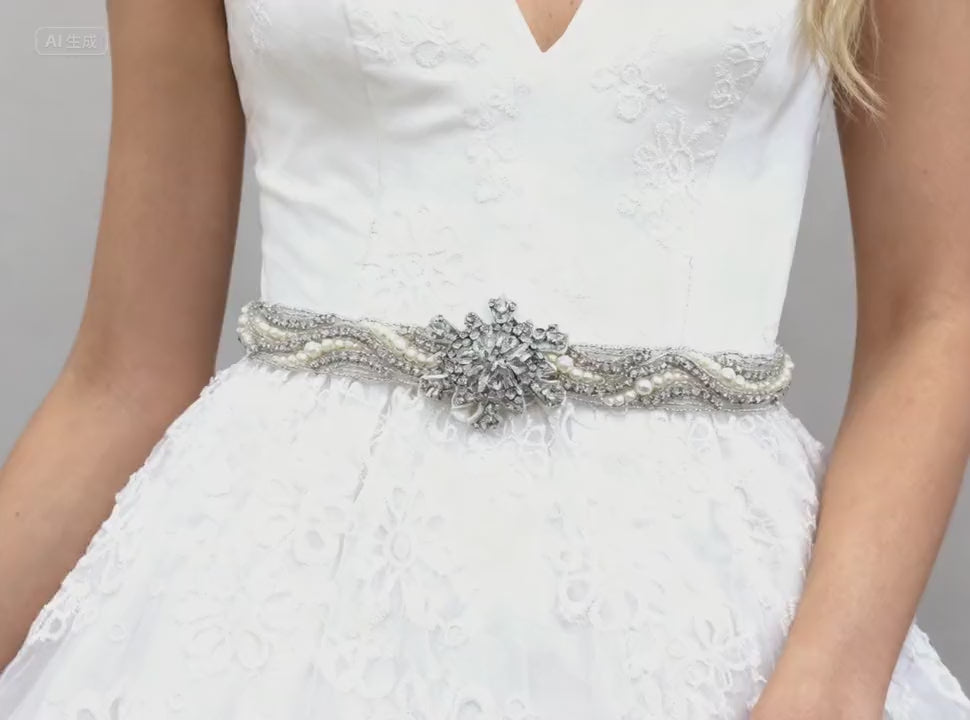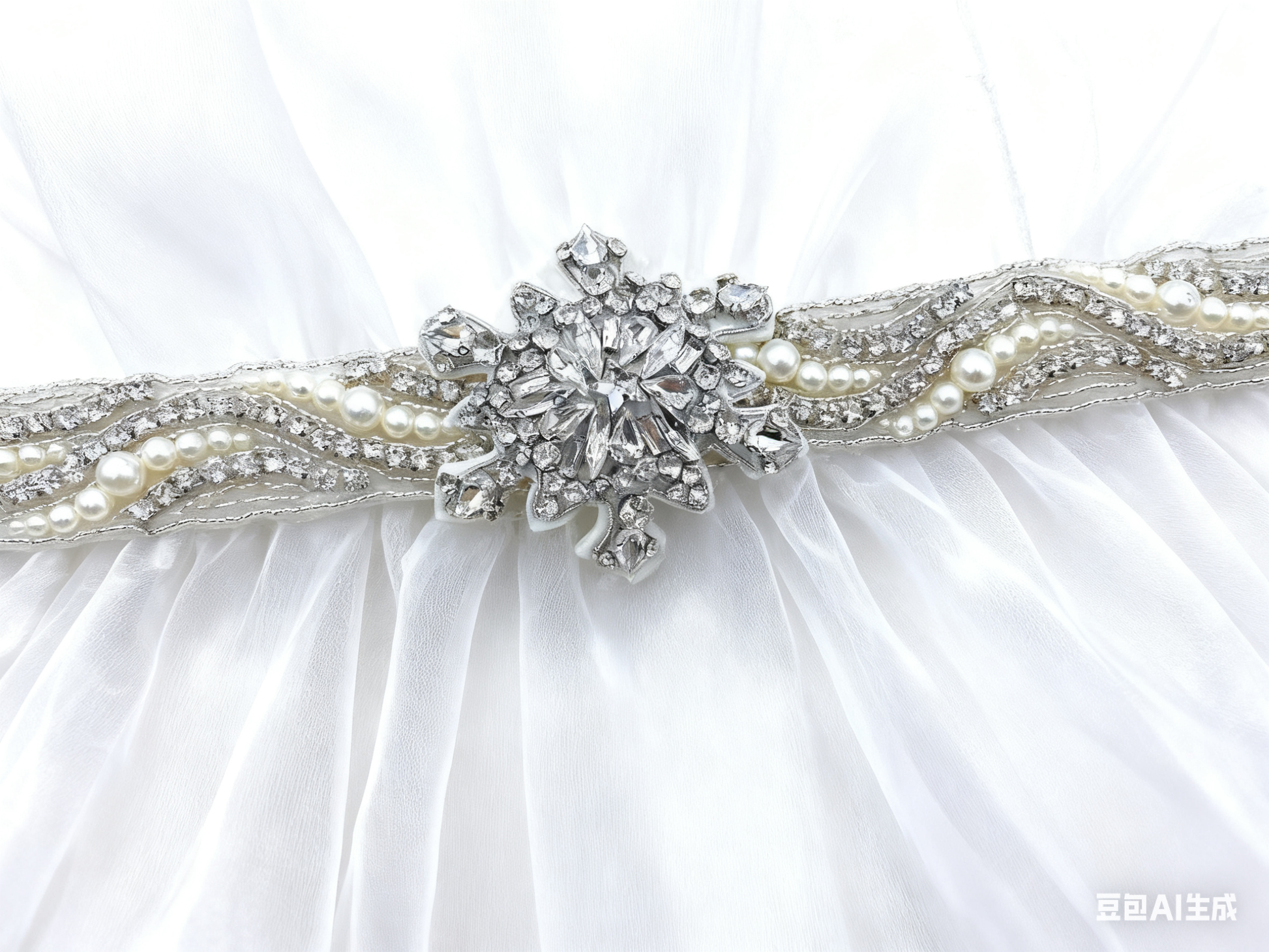 This exquisite satin belt features a stunning snowflake design at its center, symbolizing purity and elegance. The intricate snowflake is adorned with sparkling rhinestones and lustrous pearls, capturing the essence of winter beauty. Crafted for brides seeking a unique accessory, this belt adds a touch of glamour to wedding gowns. The smooth satin fabric drapes beautifully, enhancing the silhouette while providing a comfortable fit. Whether worn for a winter wedding or a romantic celebration, this belt embodies sophistication and charm, making it a perfect choice for brides who want to shine on their special day.