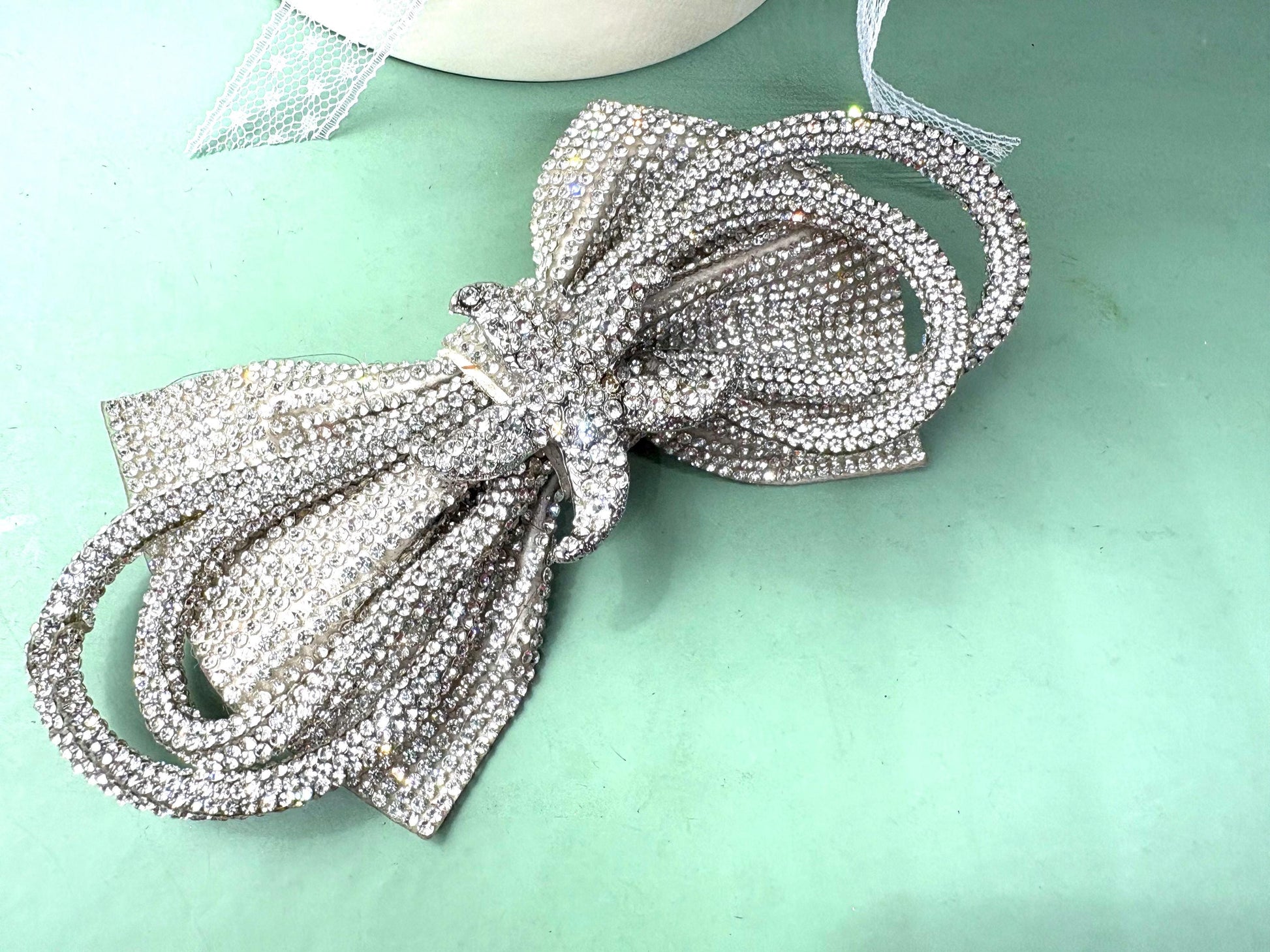 Properties: glass clear rhinestone crystals Color: silver Shape: bow shape